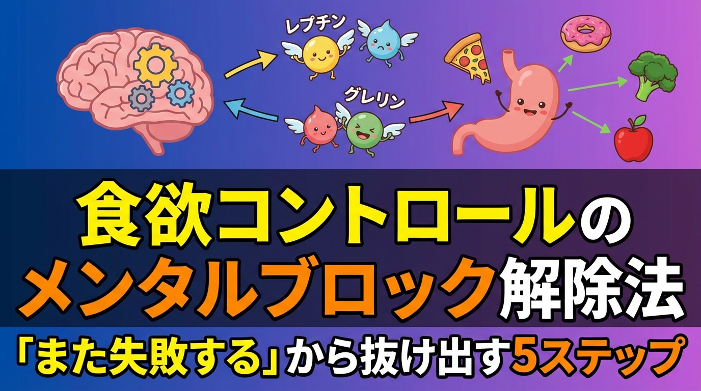 食欲をコントロールできないのは、多くの場合、3つのメンタルブロックが原因なんです。これらは無意識のうちにあなたの食行動を支配し、「また食べてしまった」という悪循環を生み出しているんですね。